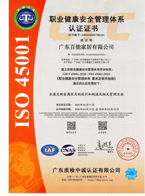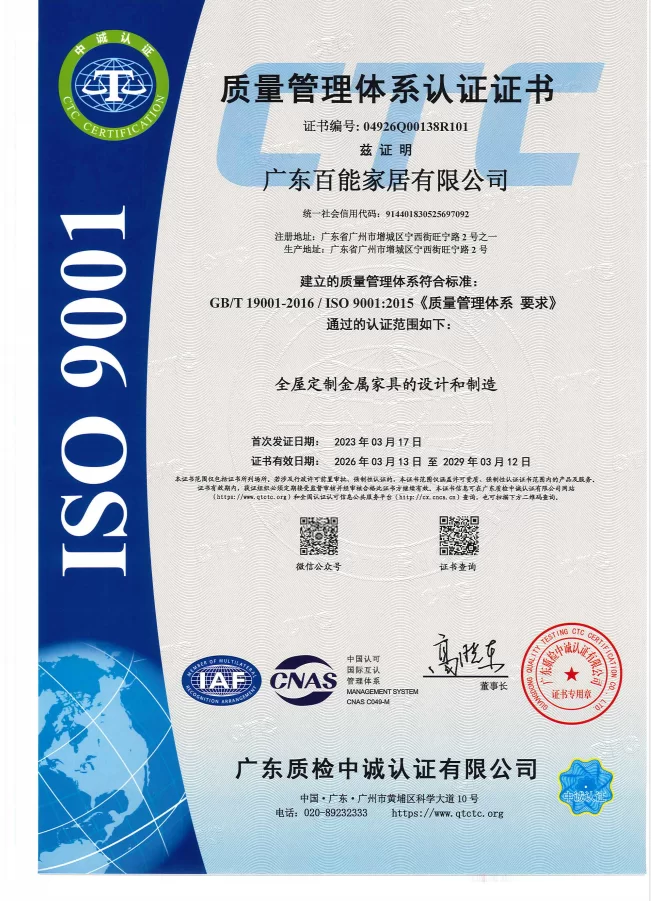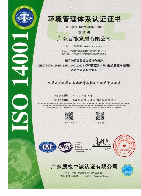 百能家居始终坚持安全环保的承诺,获得中国环境标志产品认证,确保产品在全生命周期内绿色低碳。公司严格遵循质量管理体系、